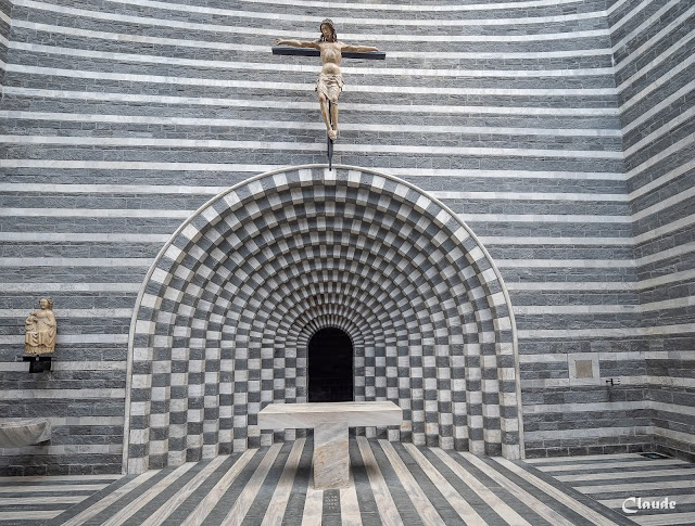Monsieur Mario Botta, un artiste architecte suisse, a dessiné cette nouvelle église, un chef d’œuvre en marbre et granit de la région.